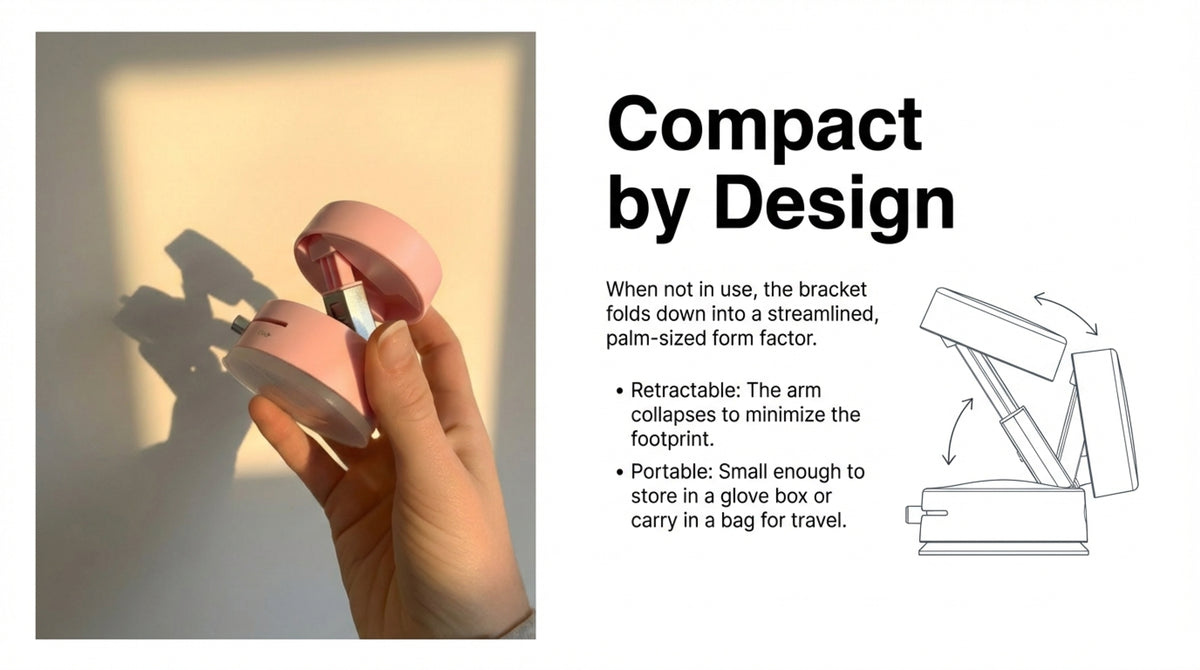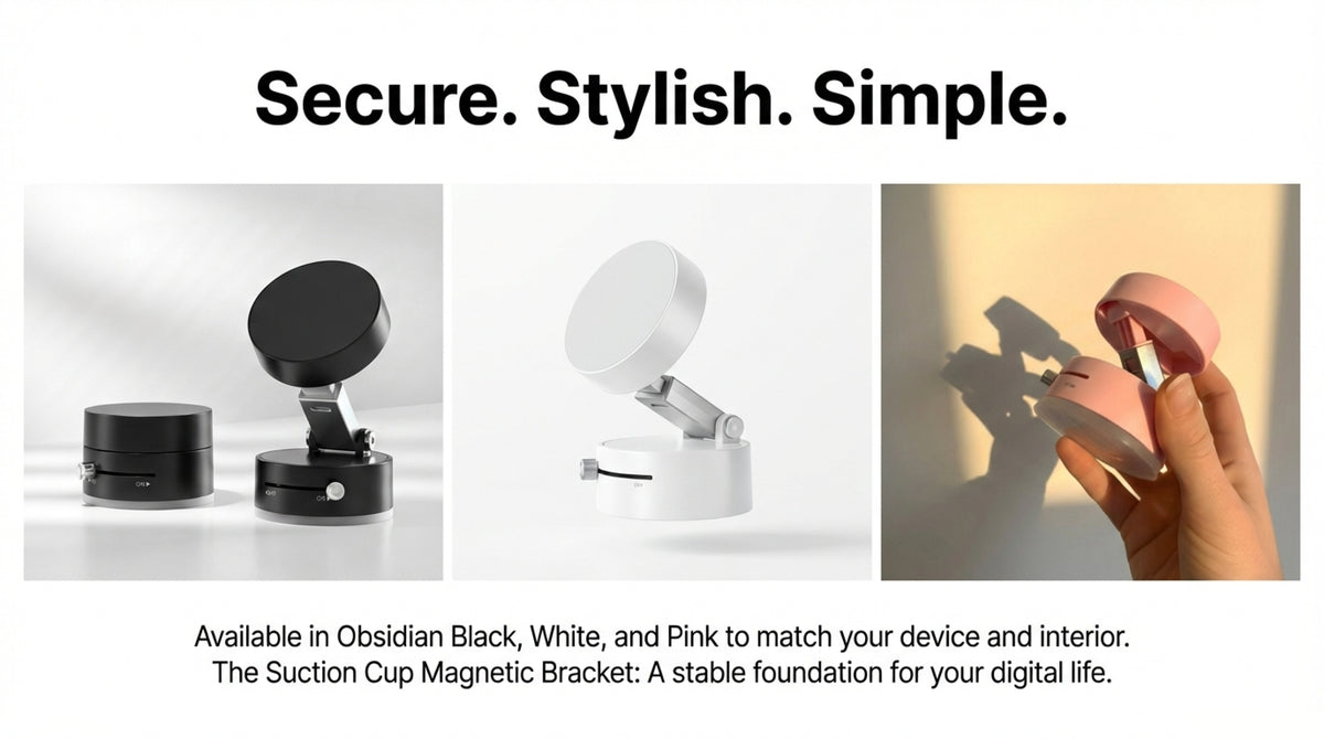Crafted from durable alloy, this universal phone holder features advanced vacuum adsorption and magnetic technology. Available in Star Moon White, Obsidian Black, and Cherry Blossom Pink.