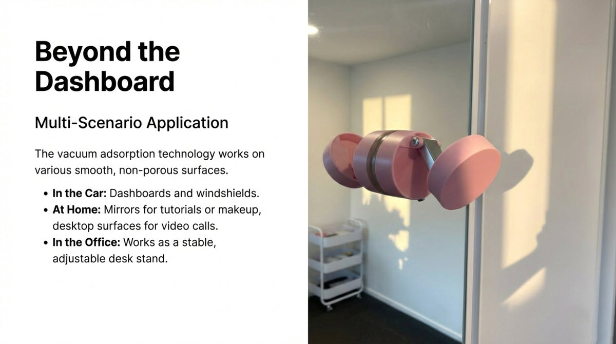 It works best on smooth, flat, non-porous surfaces like dashboards, windshields, mirrors, and even glossy plastics or metal. Ensure the surface is clean before installation for the strongest vacuum seal.